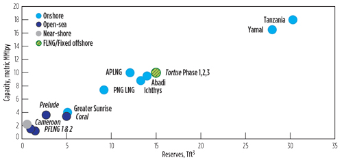 FIG. 4. Capacity (metric MMtpy) of LNG facilities vs. reserves. Capacities greater than 4 metric MMtpy benefit from onshore development. |