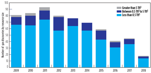 A dwindling number of new gas finds. FLNG faces another problem. The majority of gas discoveries globally are less than 0.5 Tft3 in resource size, making FLNG uneconomic, while fields with a resource size greater than 5 Tft3 tend to inspire onshore developments. The number of discoveries within this resource band has dwindled considerably since 2012, in line with a falling number of discoveries overall (Fig. 5).