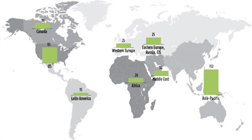 Hydrocarbon Processing’s Construction Boxscore Database is tracking more than 1,300 projects around the world. The gas processing/LNG sector represents approximately 32% of active projects globally. These projects are located primarily in the Asia-Pacific region, followed by the US, Eastern Europe, Russia and the Commonwealth of Independent States (CIS), and the Middle East. In total, the Asia-Pacific, US, Eastern Europe, Russia and CIS regions account for nearly 70% of active gas processing/LNG projects. The Middle East represents approximately 8% of active gas processing/LNG projects. Many of these projects are in response to utilizing natural gas for power generation in lieu of coal-fired power generation. GP