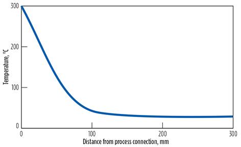 FIG. 1. When 300 C process gas meets uninsulated tubing, its temperature drops drastically, cooling to 30 C in about 120 mm of bare tubing. Image adapted from Gross and Bundschuh.1 |