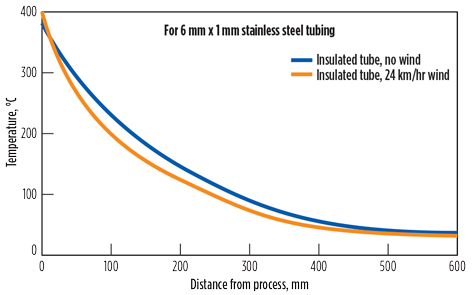 FIG. 2. With insulated tubing, hot process gas will cool to the ambient temperature after only 0.5 m of tubing. Image adapted from Gross and Bundschuh.1 |