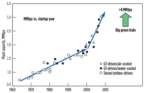 Drivers for LNG technology selection. For years, CAPEX has been the most important driver in scope and technology selection for oil and gas plants. On the client side, the focus on CAPEX has placed more emphasis on economy of scale, meaning bigger-capacity trains with significant benefits for technology development in terms of equipment size (Fig. 1).