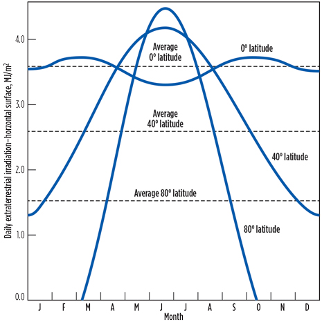 FIG. 4. Seasonal variation of daily extraterrestrial solar radiation (irradiation) on a horizontal surface outside the earth’s atmosphere in the northern hemisphere.7 |