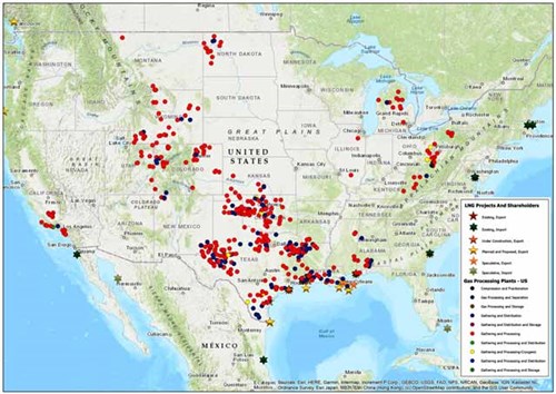 Operational gas processing/LNG infrastructure and active projects in the U.S Source: Energy Web Atlas |