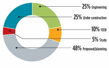 Hydrocarbon Processing’s Construction Boxscore Database and Gulf Energy Information’s Energy Web Atlas are tracking more than 400 active gas processing/LNG projects around the world. The gas processing/LNG sector represents approximately 32% of active midstream/downstream processing projects globally. When analyzed, nearly 60% of active gas processing/LNG projects are in Asia-Pacific and the U.S. Active project market shares for Asia-Pacific and the U.S. are 35% and 23%, respectively. When broken down by activity level, approximately 75% of active gas processing/LNG projects are in the preconstruction phase. GP