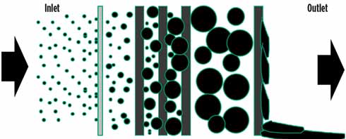 Properly designed gas coalescing systems use a complex layering of different media materials to intercept aerosols, coalesce them into large liquid droplets, and then drain the liquids from the element’s inner structure to the bottom of the vessel. Unlike filtration media, high-efficiency gas coalescing media is an advanced technology that is difficult to manufacture correctly. The actual performances of gas coalescing elements vary considerably among different vendors and product lines. Several suppliers actually advertise high-efficiency aerosol liquid removal, only to determine after onsite testing that the performance is inconsistent with the claims. Correctly designed gas coalescer elements incorporate a suite of different materials, different layering arrangements, specific media pack densities, pleat count, pore size and flow dynamics.