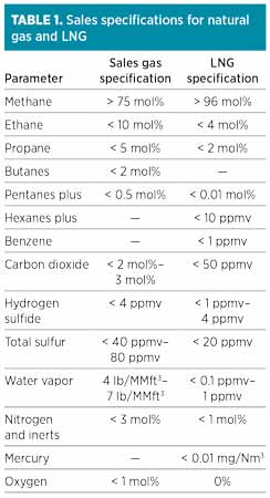 The requirements and specifications involved in LNG production are stringent and often difficult to meet and maintain. Conventional natural gas plants, by comparison, can have more lenient product specifications, as shown in Table 1. The gas purity required for liquefaction is higher than that for sales gas in several respects, such as heavy hydrocarbon content, CO2, O2 and water. Additional restrictions are present for mercury and benzene that are not of major concern in conventional gas plants.
