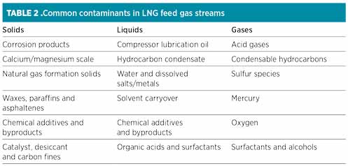 Contaminants are most usefully classified according to their source, as the source is the best location to implement a solution for removal or mitigation. The knowledge and resources to identify contamination and determine its source are essential for proper process and contamination control. The most common sources of contamination in LNG facilities are the feed gases discussed in this paper. Other contaminants, such as solvents, process materials and additives, and process-generated contaminants, are important but not discussed in this article.