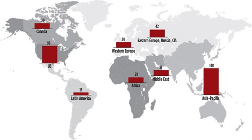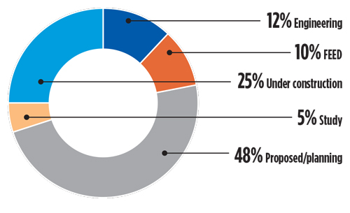 Hydrocarbon Processing’s Construction Boxscore Database and Gulf Energy Information’s Energy Web Atlas is tracking more than 420 active gas processing/LNG projects around the world. The gas processing/LNG sector represents approximately 32% of active midstream/downstream processing projects globally. Over the past year, nearly 150 new gas processing/LNG projects have been announced. Most of these projects are in the Asia-Pacific region, which continues to build out its natural gas infrastructure. This includes the construction of gas processing plants, natural gas pipelines and LNG export and import capacity. GP