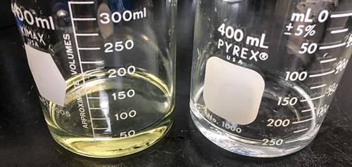 Fig. 6. Amine solvent before (left) and after (right) activated carbon product screening. |