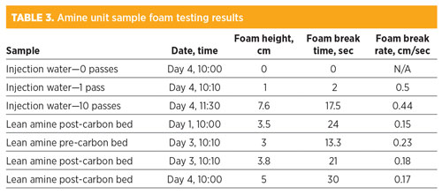 Foam testing. Several samples were taken from the amine system and from Unit 1 at the amine contactor inlet for foam testing to determine relative foam tendency and stability. The results, shown in Table 3, revealed the degree of amine foaming at the unit. The treatment of samples, followed by foam testing, revealed potential solutions to eliminate or reduce foaming.