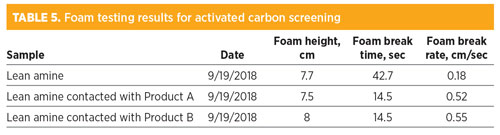 Several activated carbon products were screened for their ability to reduce foam tendency and stability in a lean amine sample taken at the plant. The amine was passed through the column at a low flowrate to achieve a contact time of 15 min. Table 5 shows the results from the activated carbon screening. The results indicated that both carbon products were effective in reducing foam stability in the amine solvent. The foam tendency, however, was not affected significantly by either carbon product. Based on the reduction in foam break time, both products were determined to be effective solutions for foam reduction, and Product A was chosen for implementation at the amine unit. Fig. 6 shows the results of the activated carbon testing.
