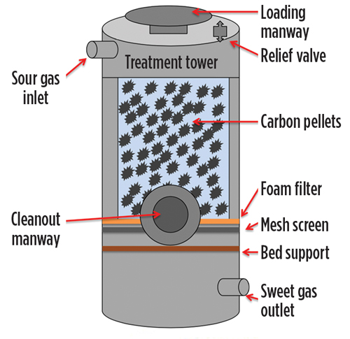 | Fig. 1. The treatment towers can operate for a number of days before needing a new charge of carbon particles, depending on the H2S content of the gas. The Catarina site has six identical towers. Diagram courtesy of Emerson. |