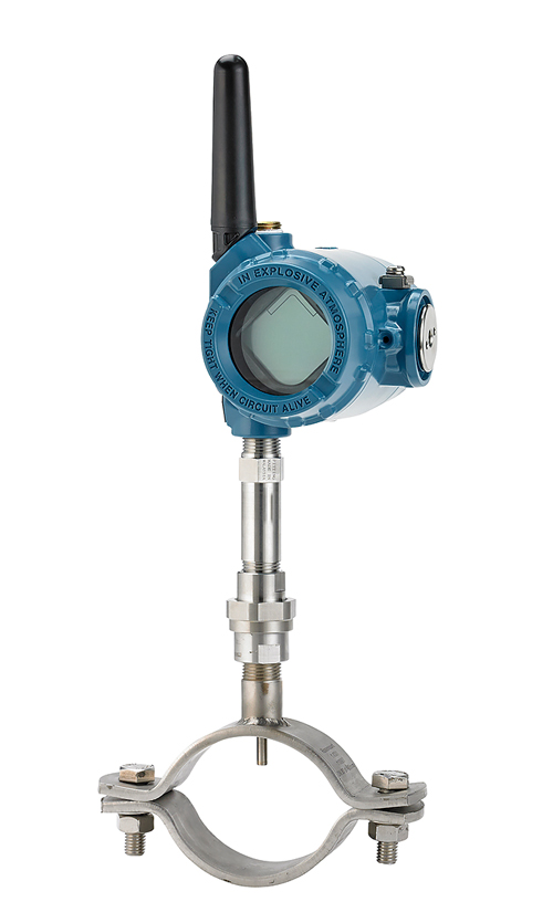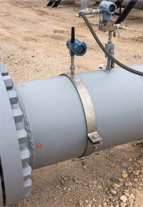 The problem was solved using an externally mounted surface reading technology, which is able to perform its action without a process penetration of any kind (Fig. 2). Each unit combines a resistance temperature detector (RTD) sensor with a WirelessHART transmitter designed to mount on the outside of a pipe using a clamp. The sensor makes firm contact with the surface of the pipe so it can measure the heat being transferred through the pipe wall from the gas inside. Based on pipe dimensions and material, it is able to calculate the internal reading based on the amount of heat transferred through the pipe wall.