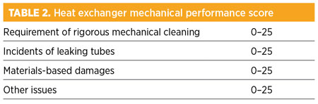Similarly, a score is recorded by the personnel that have been maintaining the mechanical performance of the heat exchanger throughout its life. The parameters that should be considered when assigning a score based on mechanical performance may include rigorous mechanical cleaning, incidents of leaking tubes and other mechanical damages associated with materials selection. The user may include other parameters, as well, depending on specific issues with a heat exchanger. Other parameters may include ease of maintenance, like re-tubing, rolling, welding of plugs or leaking tube-to-tubesheet joints, etc.