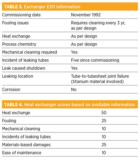 These performance scores are assigned based on regular evaluations by process and operation engineers. However, as per requirements, more entries can be made in Table 1 to log the issue and reflect it when categorizing the heat exchanger. For reference purposes, only the heat exchanger value and fouling have been listed. As an example, other performance variables may include process chemistry and properties. Those process properties, not as per original design data, may also affect the heat exchanger performance. All in all, Table 1 should be completely managed by process and operations teams, and appropriate scoring should be provided. The total score should sum to 100.