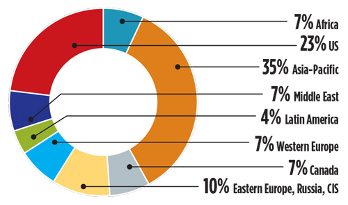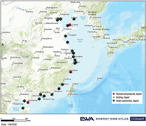 Hydrocarbon Processing’s Construction Boxscore Database and Gulf Energy Information’s Energy Web Atlas are tracking more than 420 active gas processing/LNG projects around the world. Most of these projects are in the Asia-Pacific and U.S. regions. In total, these two regions account for nearly 60% of active gas processing/LNG projects—Asia and U.S. market share are 35% and 23%, respectively. Gas processing/LNG projects are led by developments in China (FIG. 1) and India. Both countries are investing heavily to boost LNG import infrastructure to increase the share of natural gas in their total energy mix. G