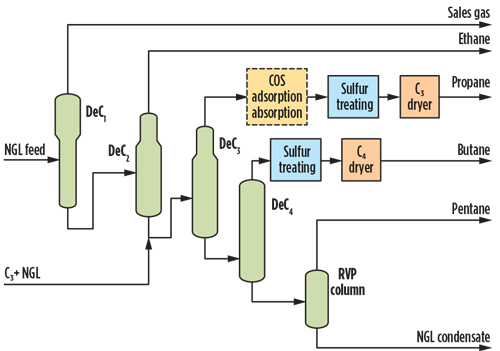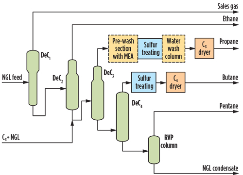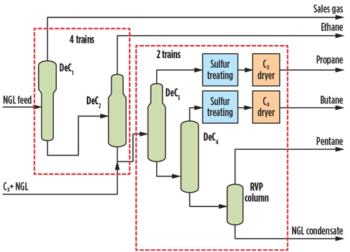 Project scope. The NGL fractionation trains will receive a C3+ stream from the demethanizer bottoms and a C3+ stream from the condensate stripper bottoms feed from the plant. The NGL fractionation train will fractionate the C3+ NGL feeds into propane, butane, pentane, natural gasoline and color body products.