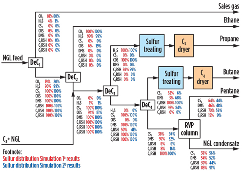 Process simulation. It is important to understand the sulfur species distribution across the fractionation train. This will enable the process designer to determine the expected total sulfur content and accordingly identify the amount of COS required to be removed to meet the total sulfur specification.