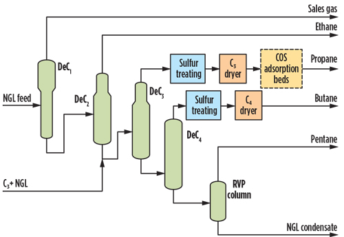 Fig. 3. Option 1 NGL fractionation simplified flow diagram with COS regenerable adsorption beds.
