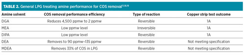 In the fractionation unit, the majority of the COS ends up in the propane stream.16 In the LPG product, COS can be removed through amine LPG treating and adsorbent treatment. Each amine has a different COS removal performance, depending on the thermodynamic reaction associated with the particular amine. The performance for each amine is tabulated in Table 2. It is reported that, even though MEA can reach the expected copper strip test outcome, MEA is not suitable since it is susceptible to degradation by COS.17 The MEA irreversible reaction has made DIPA and DGA the most preferred solvents for use in COS LPG treatment.