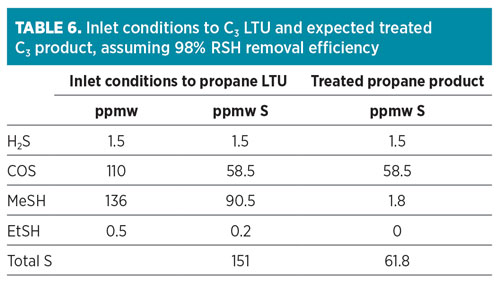 Assuming the propane product is treated with a conventional caustic wash process for its liquid treatment unit (LTU), the expected total sulfur content in the treated propane product is 61.8 ppmw (assuming 98% removal efficiency for mercaptans and no removal of H2S and COS as tabulated in Table 5). It was demonstrated that COS accounted for approximately 95% of the total sulfur content in the treated propane product. This concentration exceeded the maximum total sulfur specification of 30 ppmw. It is necessary to remove as much COS as possible to meet the total sulfur specification for the propane product stream.