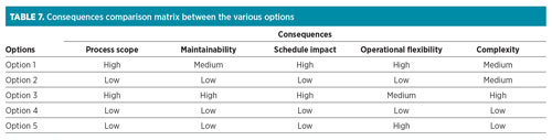 Selection of optimum solution. As identified at a later stage of the project, a higher content of COS will be present in the feed gas. The technology selected must result in the lowest impact to the project and process equipment without jeopardizing process specifications. A simplified technical matrix was developed to summarize the relative advantages and disadvantages of the various options, as shown in Table 7. Each option is compared against the relative consequences in terms of process scope, maintainability, project deliverability and complexity. At this stage, the cost impact is not included, as the primary focus is the schedule impact.