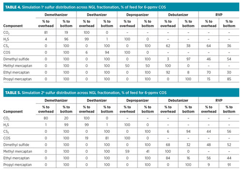 For COS, as per Simulation 1,a 6% of the content from the feed will be with the ethane product, while the remaining feed will flow with the propane stream. For Simulation 2,b the approximate amount of COS in the feed that will be with the ethane product was simulated as 19%, while the remaining will be with the propane product. The overall distributions across the NGL fractionation summary for both simulations are indicated in Fig. 2.
