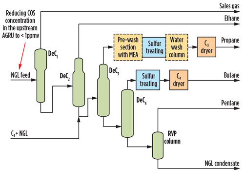 | Fig. 2. NGL fractionation simplified flow diagram for 6-ppmv COS in the inlet feed. |
