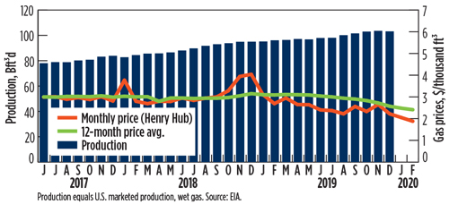 | U.S. gas production (Bft3d) and prices ($/Mcf) |