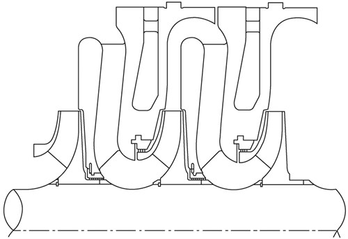 Fig. 1. Seals are required at the impeller eye and rotor shaft to prevent gas backflow from the discharge to the inlet end of a compressor stage. |