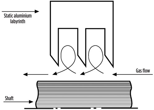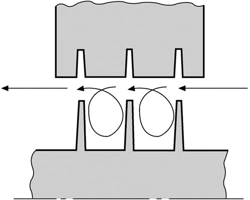 A labyrinth seal works by acting as a series of restrictions, like a series of orifices. Turbulence between the teeth causes resistance, in addition to the restriction itself (Fig. 3). Following a rub, the tips of the aluminum labyrinths are mushroomed and limit the turbulence between the teeth. Leakage is then increased due to the higher leakage rate and the reduced turbulence between the teeth.