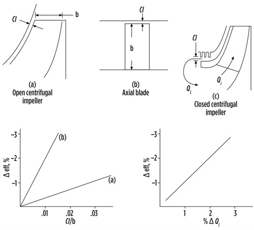 Fig. 6 shows the effect of efficiency vs. clearance for various designs. In graph (a), an open centrifugal impeller, the efficiency loss is only one third of a point for each percent of tip clearance ratio at the impeller outer diameter. In graph (b), an axial compressor blade, the efficiency loss is about two percentage points for each percent of tip clearance ratio. This is also true for the throat region of an open centrifugal impeller. In graph (c), for a closed centrifugal impeller, the efficiency loss is about one percentage point for each percent increase in Qi (as a result of QL increasing and constant inlet flow to the compressor).