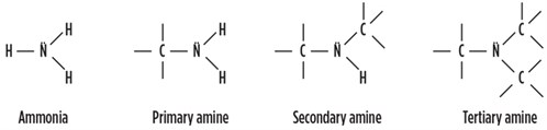 Amines are organic compounds with ammonia (NH3) as the fundamental base compound. By replacing one or more of the hydrogen (H2) atoms with an organic hydrocarbon group, different types of amines are formed—i.e., a primary amine, a secondary amine and a tertiary amine (FIG. 1).