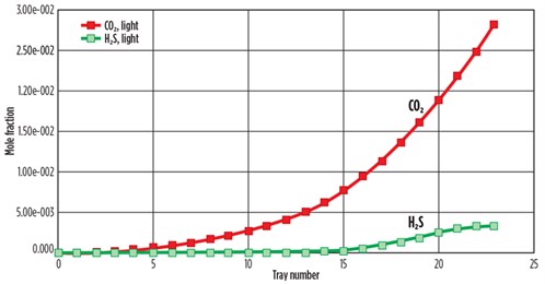 FIG. 4 shows the simulated concentrations of H2S and CO2 mole fractions with the tray number in the top of the desorber. The concentrations of H2S and CO2 at Tray No. 3 in the full rich acid case gradually decreased to zero at Tray No. 15.