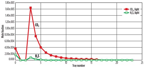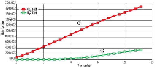 FIG. 3. Composition of feed acid gas with tray position in absorber for DEA treatment.