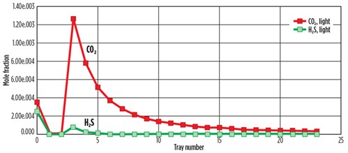 FIG. 6. Composition of feed acid gas with tray position in desorber for MDEA treatment.