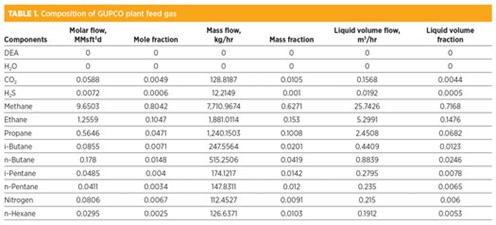 TABLE 1 shows the composition of rich feed gas to the amine unit. FIG. 2 shows the batch setup for the GUPCO amine unit. To evaluate the efficiency of the tray and packed columns and to check the thermodynamic models, DEA and MDEA treatments were modeled in the simulation program.a
