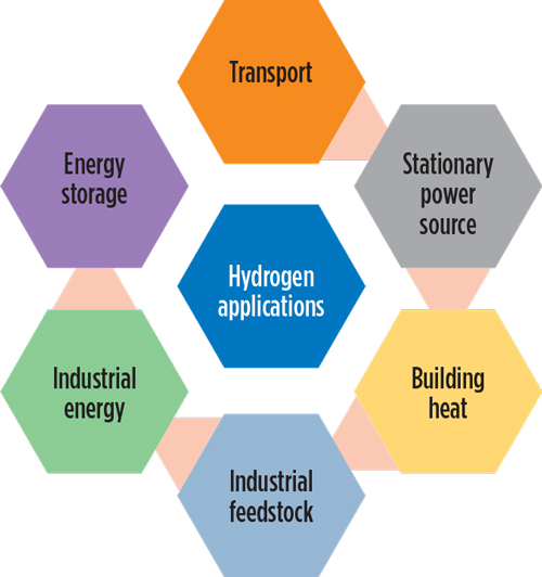 Hydrogen is an energy storage medium, as well as an energy carrier. It has multiple fuel uses—hydrogen vehicles, stationary power sources, building heating, industrial feedstock (e.g., oil refining processes, as well as fertilizer and methanol production) and industrial energy. FIG. 1 depicts the application of hydrogen in various sectors, and FIG. 2 depicts hydrogen production through renewable sources.