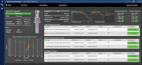 FIG. 1. A smart liquefaction display with operational intelligence. - LNG/FSRU transport. LNG/FSRU transport operators face numerous challenges, such as reducing the cost of operation, including energy, maintenance and logistics costs; meeting efficient class compliance and certification; complying with new IMO requirements in areas such as fuels, emissions and water handling; and reducing transit times with predictable, on-time arrivals and departures.