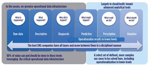 The most successful LNG operators leverage the value from analytics by first defining an analytics framework and the types of analytics, and then selecting market-proven, fit-for-purpose technologies. They use a “layers of analytics” strategy that takes into account the incremental cost vs. incremental value. These LNG operators start with descriptive, diagnostic and simple predictive analytics and move to more complex analytical methods. They eventually utilize all levels of analytics and move up to each level with discipline.