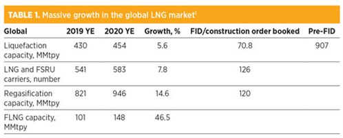 Supply chain risk mitigation. Moving into the next decade, the global LNG market will be characterized by rapid growth and expensive, long-lead-time projects with geopolitical and pricing risk. TABLE 1 illustrates the massive growth of each segment of the global LNG market and the growing complexity and optionality, as well as opportunity and risk.