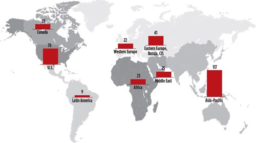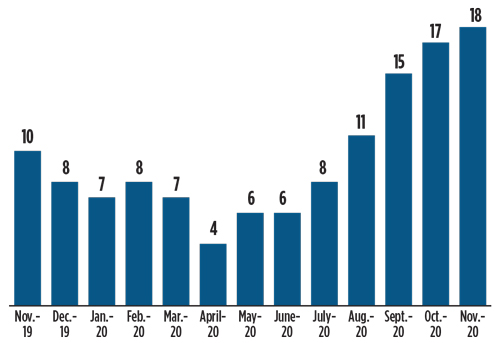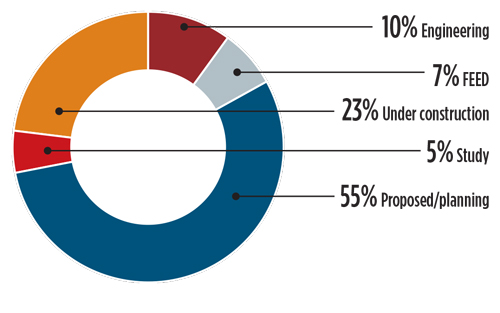 Hydrocarbon Processing’s Construction Boxscore Database is tracking more than 1,400 active projects in the hydrocarbon processing industry. Nearly 25% of the HPI’s active projects are within the gas processing/LNG sectors. Most of these projects—approximately 35%—are in the Asia-Pacific region, followed by the U.S. (21%). Since regional, national and local lockdowns and travel restrictions—effects of the COVID-19 pandemic—have eased, new gas processing/LNG projects have increased over the past several months. At the height of global lockdowns, new project announcements in the sector fell to 4 in April. However, new project announcements have begun to increase, reaching 18 in November. GP
