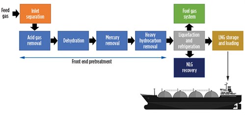 LNG production (FIG. 1) begins with inlet separation of contaminants from the feed gas stream, followed by H2S and CO2 removal, water removal, mercury removal and higher-molecular-weight hydrocarbon removal. The gas stream, which is predominantly methane, is then liquefied at –160°C in an aluminum cryogenic heat exchanger. The liquefied product is normally transferred and stored in specialized LNG tanks onsite or on ships prior to delivery to the final destination. All stages of the LNG production process are critical, but the removal of inlet contaminants is one the most important stages as it can affect the entire LNG production sequence at the facility.