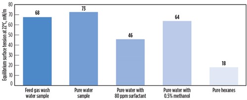 Sample analysis and testing. From the analysis and foam testing of the feed gas water wash sample, it was determined that a small but manageable amount of surfactant contamination was present in the feed gas stream. FIG. 5 shows the surface tension of the water wash sample compared to pure water, water with methanol, water with surfactants, and hexanes. It can be observed that surfactant contamination significantly reduces surface tension, as does methanol contamination (to a lesser extent). The surface tension depression with methanol at much higher concentrations is not as large as with surfactants at low concentration, because methanol is not a surfactant but changes the properties of the solvent by weakening intermolecular forces. Hexanes presented the lowest surface tension because they do not have appreciable intermolecular forces. No hydrogen bonding and only weak Van Der Walls forces are present. This is one of the reasons why hydrocarbons will, in certain cases, facilitate foam formation by lowering surface tension, but they will not stabilize foam.