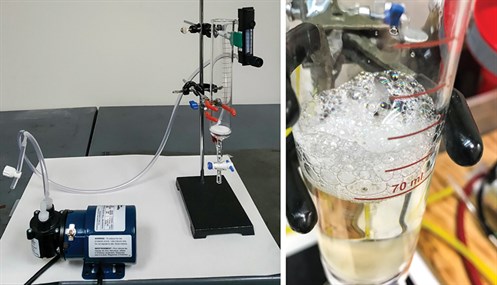| FIG. 6. Assembled foam testing apparatus (left); amine solvent with foam formation (right). |