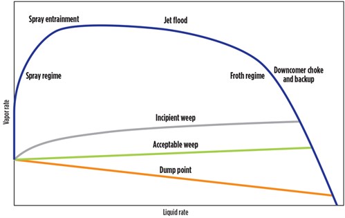 | FIG. 7. Tray flow regime diagram. Diagram adapted from Kister, H. Z., Distillation Design, McGraw-Hill, 1992. |