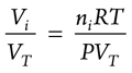 Here, P is the pressure (in pascal); V is the volume (m3); n is the number of moles (proportional to the number of molecules) of all components; R is a constant, called the universal gas constant, with a value of 8.3143 joules/K mole; T is the Kelvin (K) temperature; Vi is the partial volume of the gas component i; and ni is the molar number of gas component i.