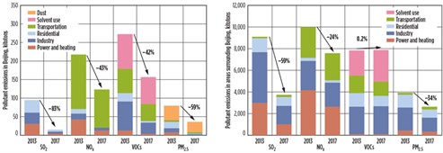 The Beijing 2013–2017 Clean Air Action Plan1 is the most comprehensive and systematic pollution control program put into practice in Beijing to date. From 2013–2017, emissions of SO2, NOX, volatile organic compounds (VOCs) and particulate matter (PM2.5) decreased by 83%, 43%, 42% and 55%, respectively (FIG. 1, left). However, during the same time period, changes in major air pollutant emissions in the areas surrounding Beijing (including Tianjin, Hebei, Henan, Shandong, Shanxi and Inner Mongolia) were not as desirable (FIG. 1, right). Other areas in the country face the same problem. To clean China’s air supply, numerous issues must still be addressed; this article was written with this task in mind.