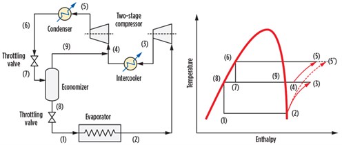 FIG. 2 shows a dual-compression, dual-expansion refrigeration system. The refrigerant vapor stream (5) at high pressure is cooled and expanded in a throttling valve. The resulting two-phase flow is separated in the economizer. The vapor is recycled back to the second stage of the compressor after having been mixed with the outlet stream from the compressor intercooler. The pressure of the liquid phase withdrawn from the economizer is reduced by means of a second throttling valve and sent to the evaporator, where it provides the refrigeration duty by evaporating at low pressure.